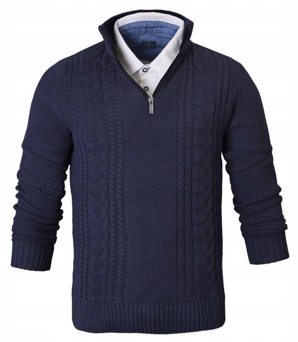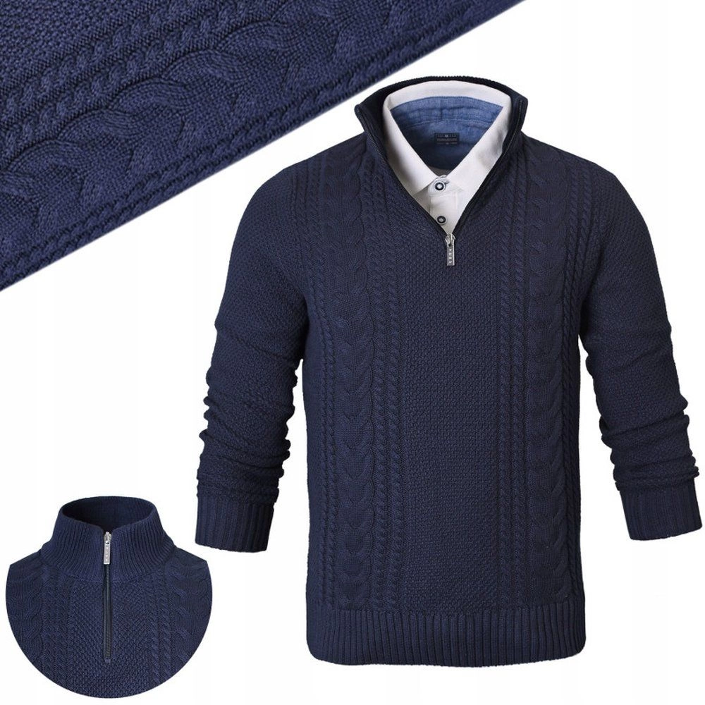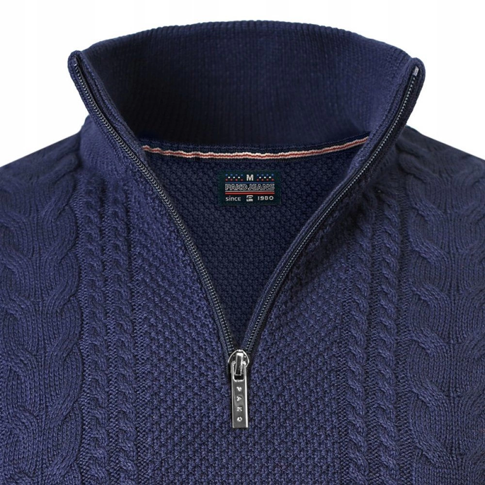 Klasyczny i elegancki męski sweter z wysokim kołnierzem na zamek polskiej marki Pako Jeans. Wykonany z doskonałej bawełnianej tkaniny. Produkt doskonale uzupełni wiosenną lub jesienno-zimową niezobowiązującą stylizację (tzw. weekendową).