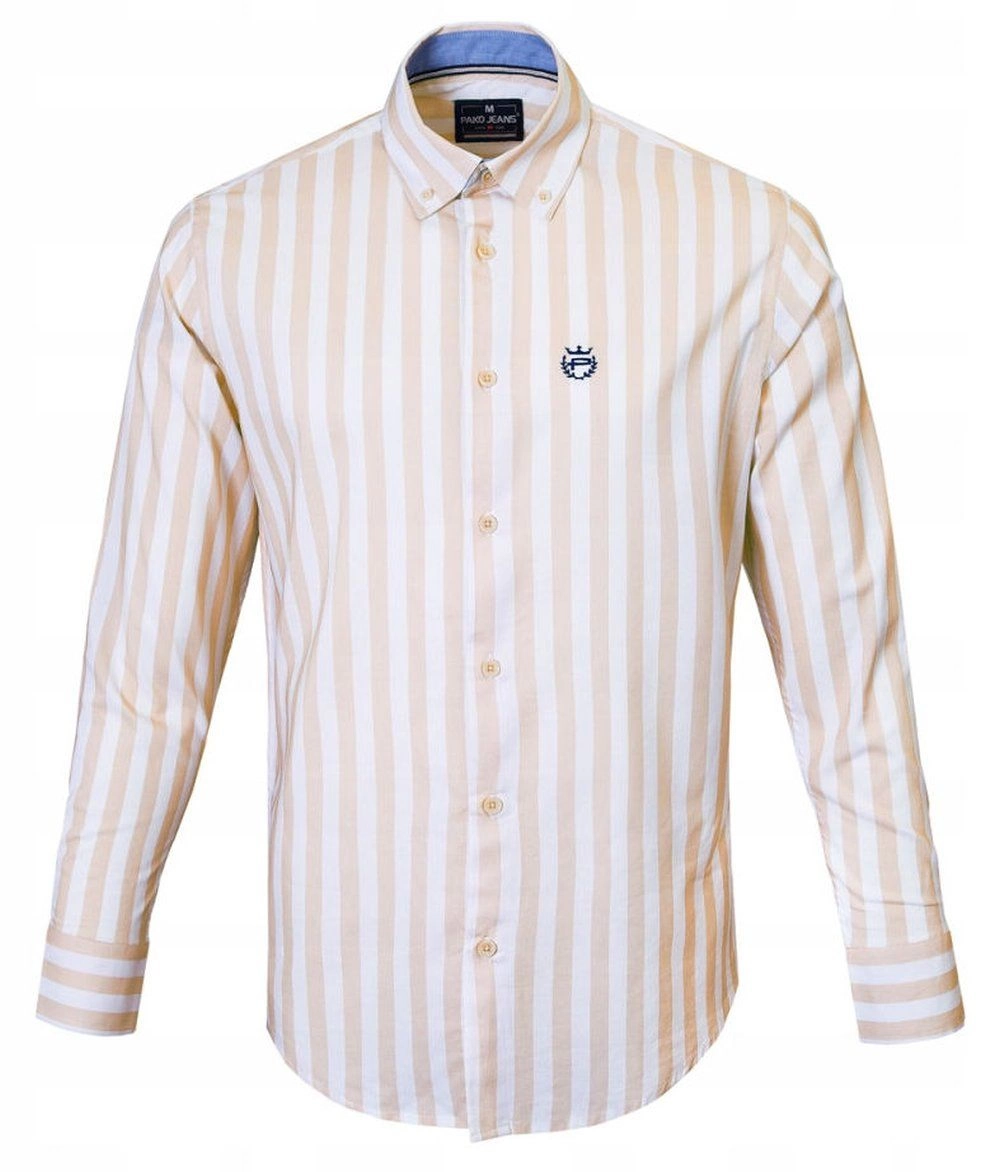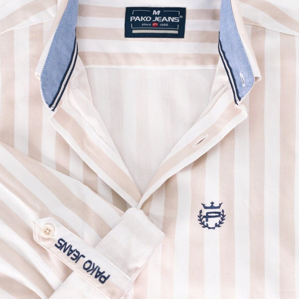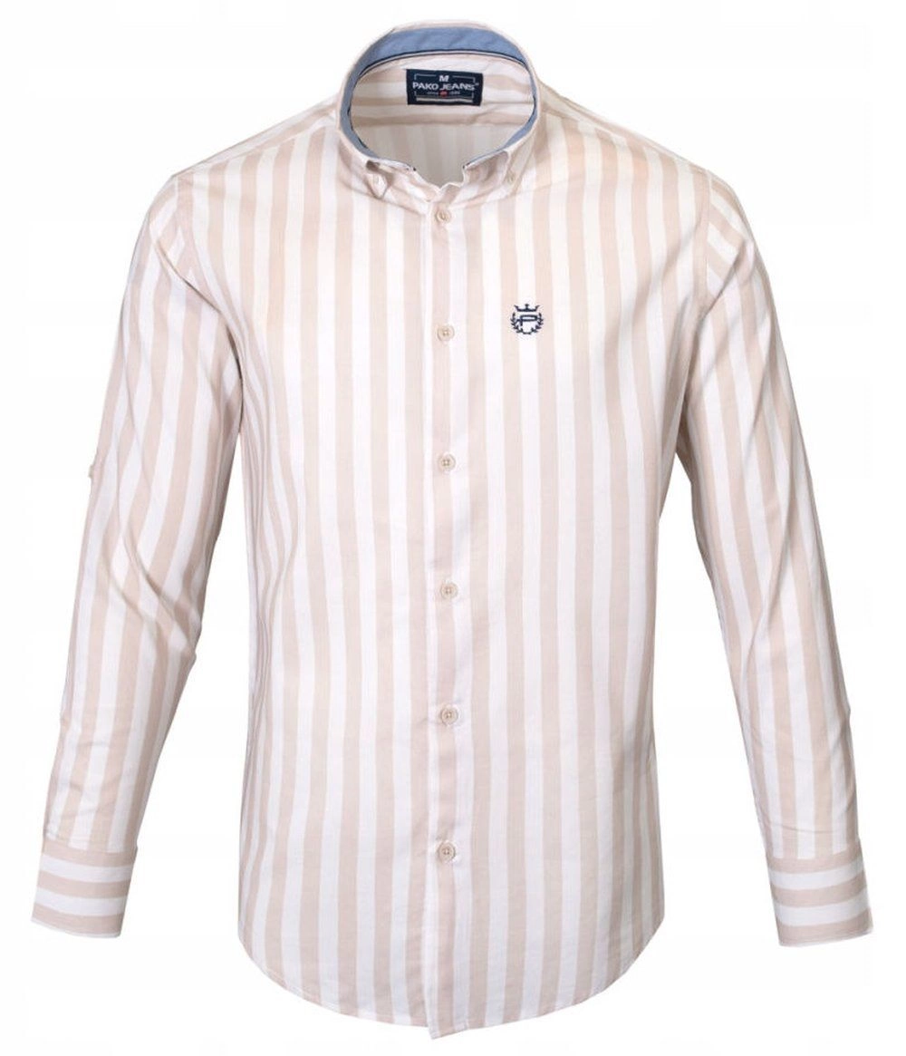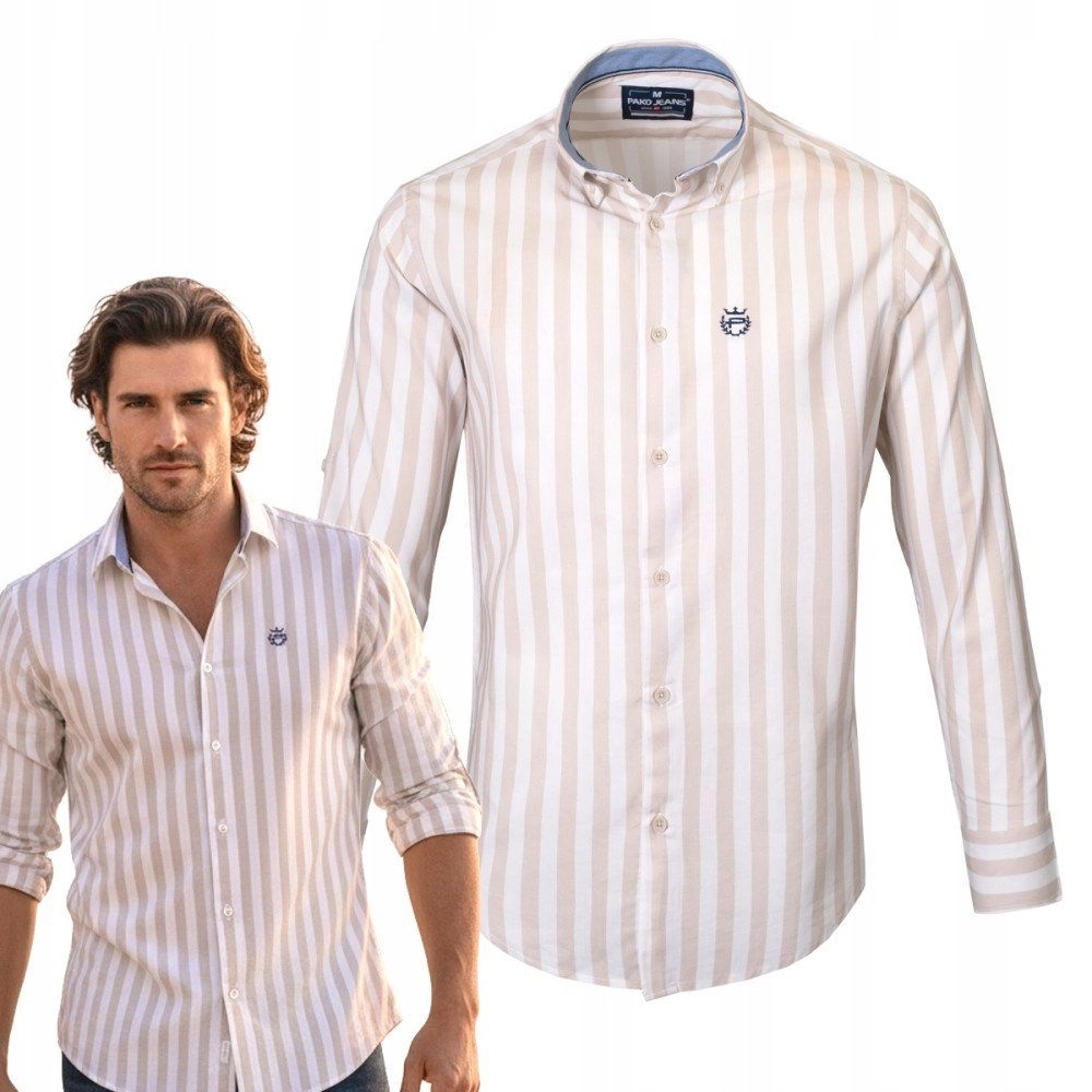 Biała, Lekko Taliowana Koszula Męska - Pako Jeans - Beżowy Prążek