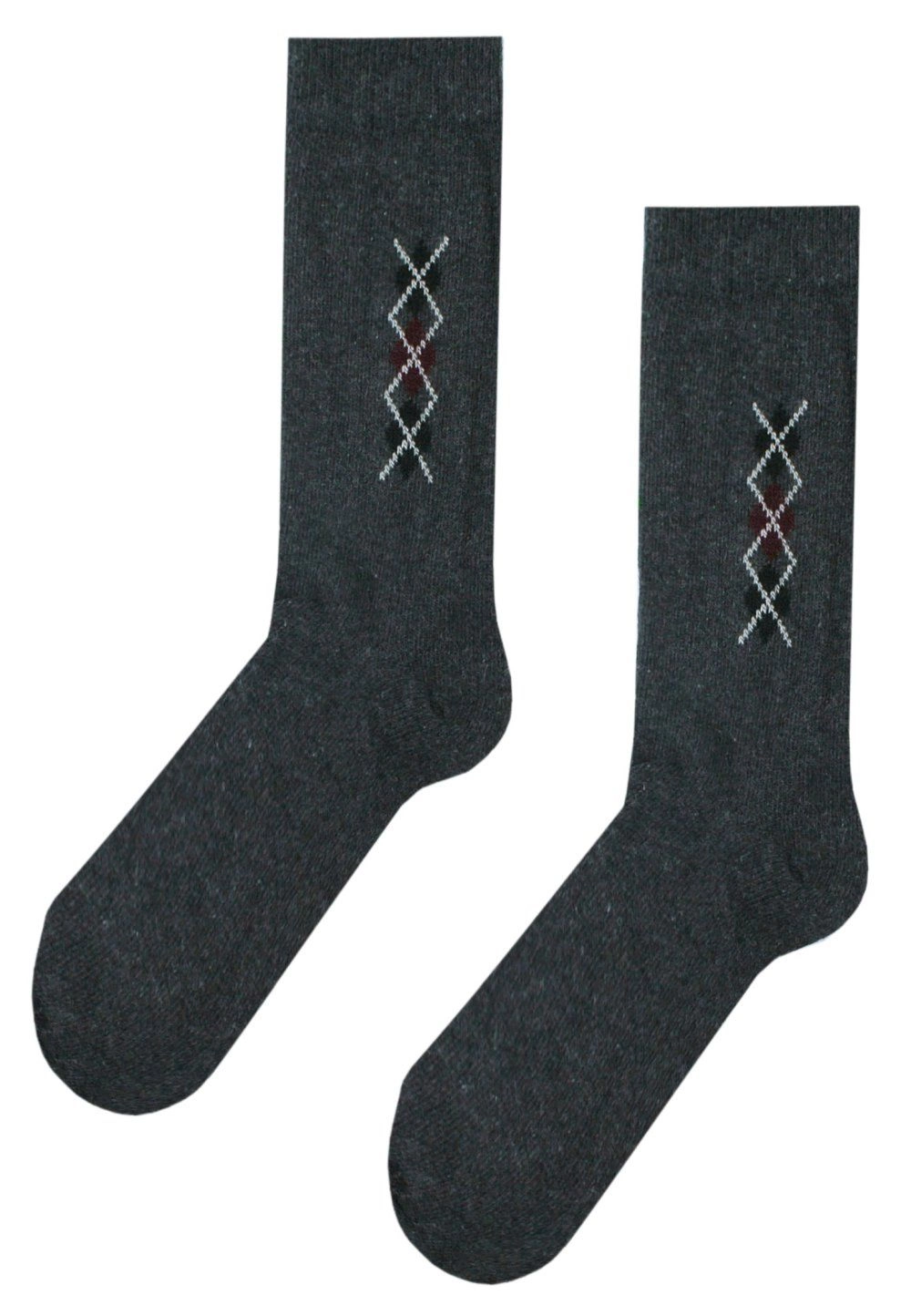 Doskonałe męskie skarpetki zimowe. Dzięki wełnie są ciepłe i praktyczne a to jest właśnie najważniejsze w odzieży na niższe temperatury. Wykończone oryginalnym wzorem.