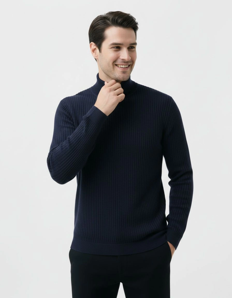 Golf Granatowy Prążkowany, Męski -100% BAWEŁNA, Super Slim, Przylegający, Elegancki -Brave Soul