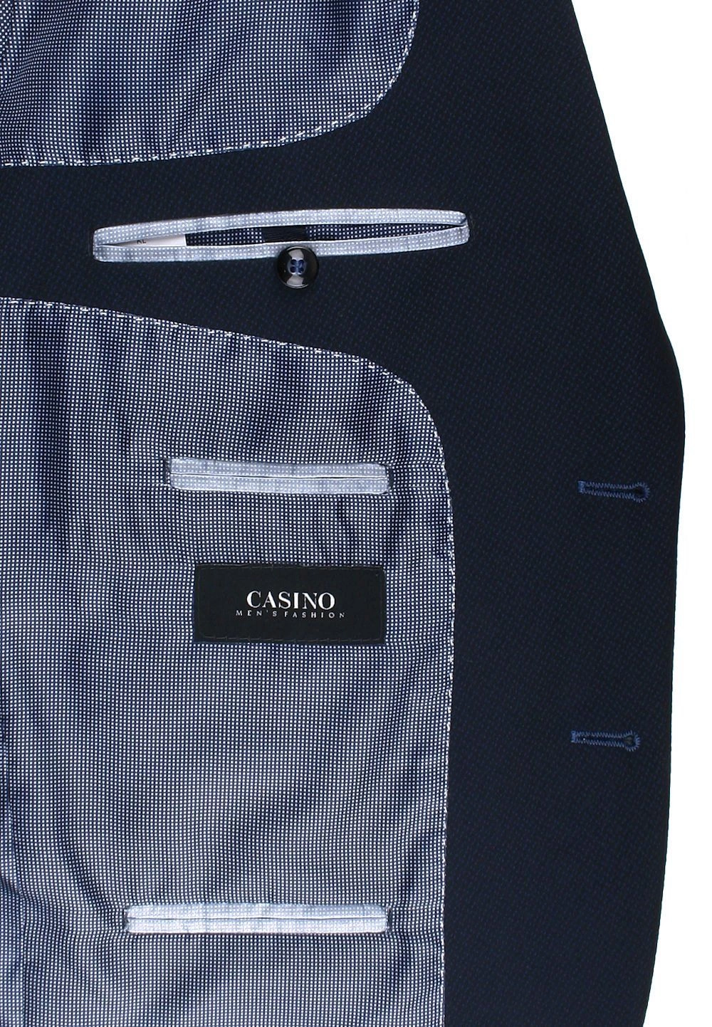 Garnitur marki CASINO jest wygodny i pełen dobrego stylu. Wykonany z wysokiej jakości materiału. Garnitur składa się z marynarki jednorzędowej oraz spodni. Marynarka o kroju slim. Zapinana jest na dwa guziki. Z tyłu posiada dwa rozcięcia. Dwie kieszenie z patką w okolicy talii oraz kieszenie wewnętrzne czynią ją praktyczną. Spodnie są bez zakładek, zaprasowane w kant. Garnitur Casino jest niezwykle uniwersalny. Z powodzeniem sprawdzi się zarówno podczas rodzinnych uroczystości jak i w sytuacjach biznesowych. Można założyć go z koszulą, krawatem lub muchą, a nawet stworzyć stylizację ślubną, ze względu na jego ponadczasowy charakter.