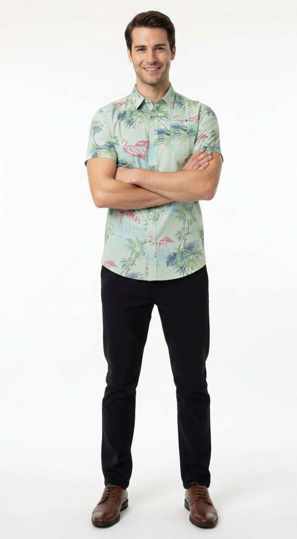 Koszula Bawełniana Zielona we Flamingi, Casualowa z Krótkim Rękawem Prosty Krój Wakacyjna BRAVE SOUL