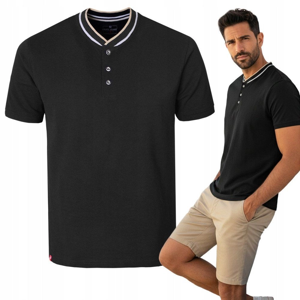 Koszulka Męska (T-Shirt) na Stójce z Guzikami - Pako Jeans - Czarna
