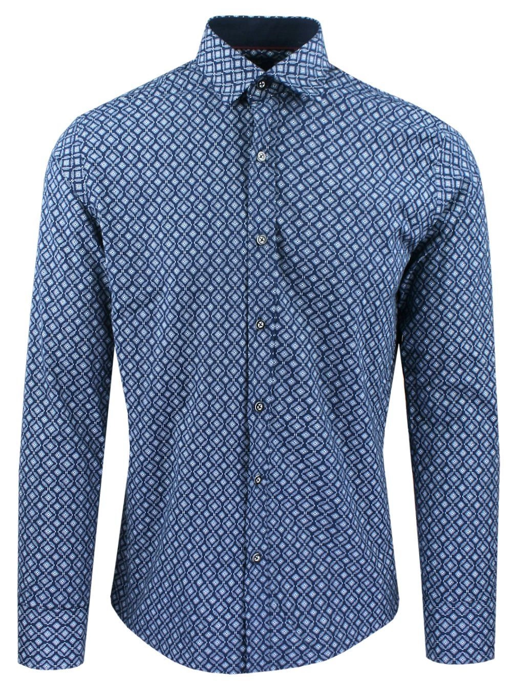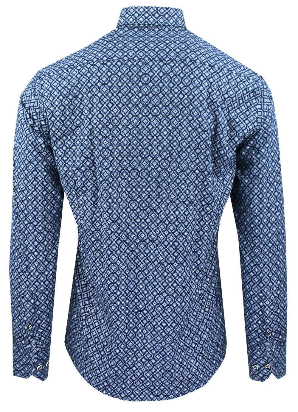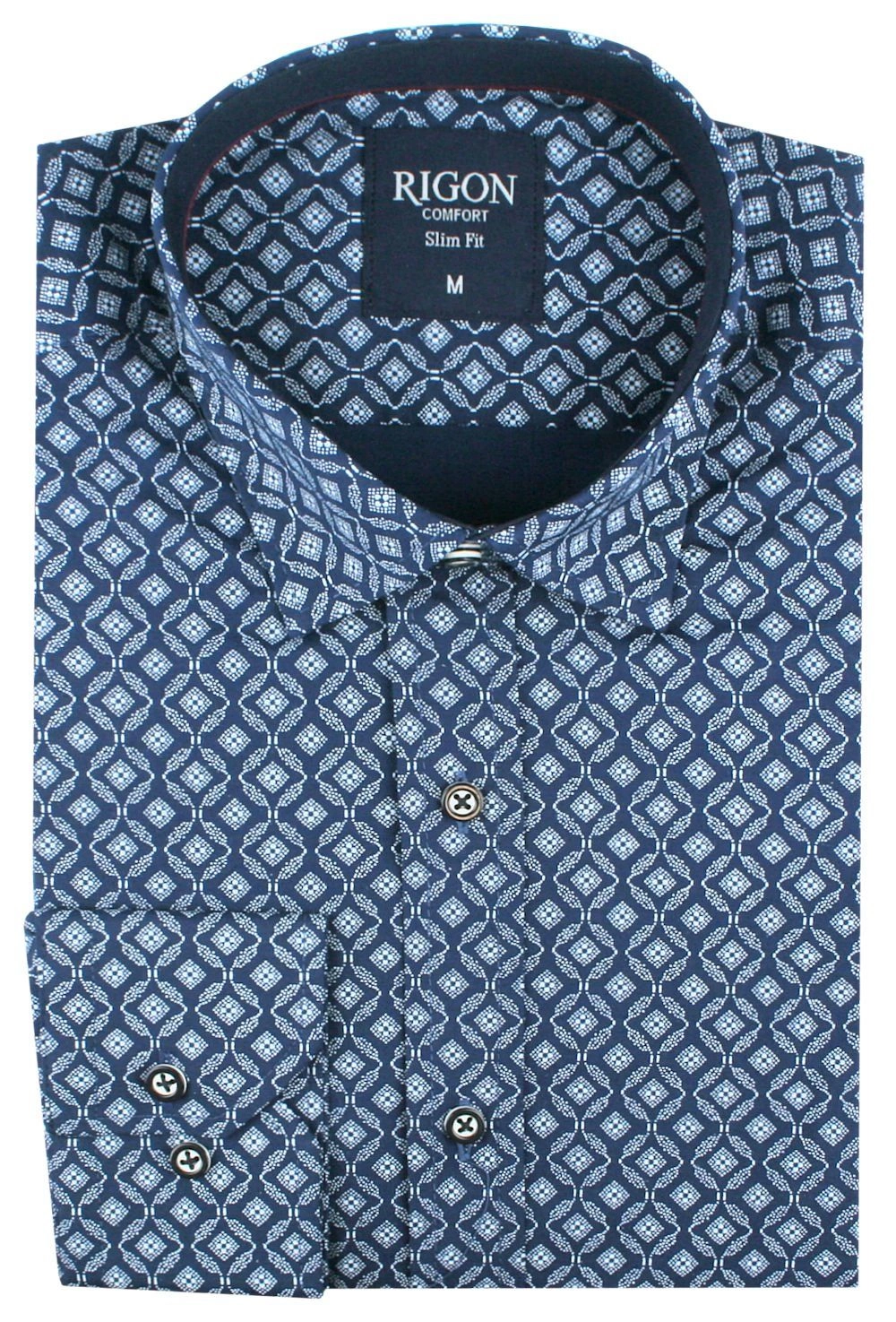 Męska Koszula, Taliowana (Slim Fit) - Rigon - Ciemnoniebieska, Wzór