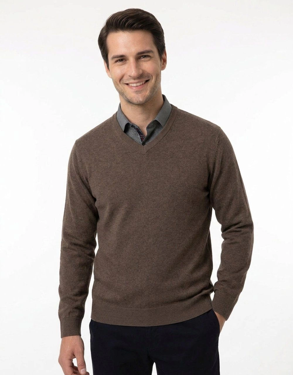 Męski, Bawełniany Sweter w Serek (V-neck) - Adriano Guinari - Brązowy