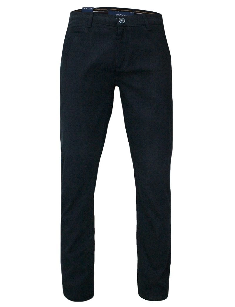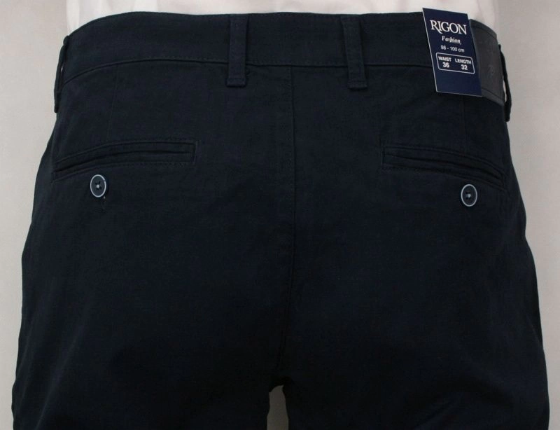 Materiałowe spodnie typu chinos marki Rigon wykonane z wysokiej jakości bawełny. Model o zwężanych nogawkach. Tkanina wzbogacona lycrą dzięki czemu zyskuje na elastyczności. Dbałość o detale wykończenia sprawiają, że spodnie doskonale mogą komponować się zarówno z marynarką lub też mniej oficjalnym strojem.