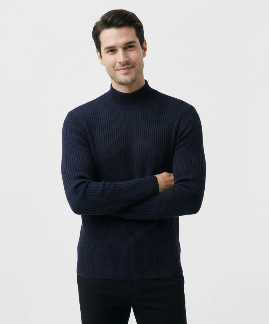 Półgolf Granatowy, Super Slim, Prążkowany, Cienki, 100% BAWEŁNA, Elegancki, Męski -BRAVE SOUL