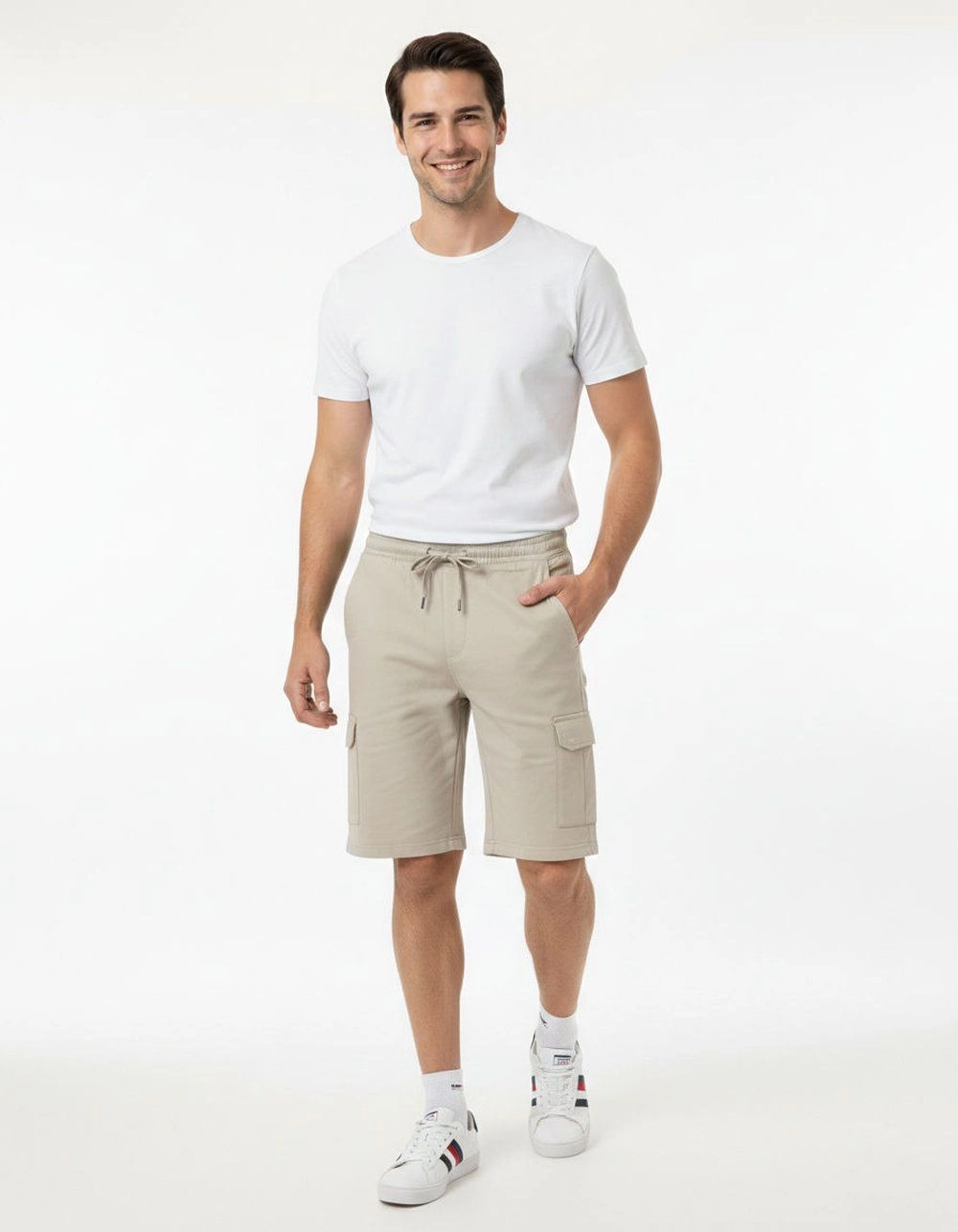 Spodenki Dresowe, Beżowo-Oliwkowe Bojówki Sportowe Szorty Casualowe, z Kieszonką, Męskie -BRAVE SOUL