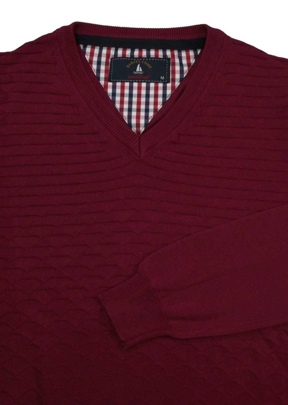 Sweter Bordowy w Serek, Bawełniany, Tłoczony Wzór, V-neck, Męski -BARTEX