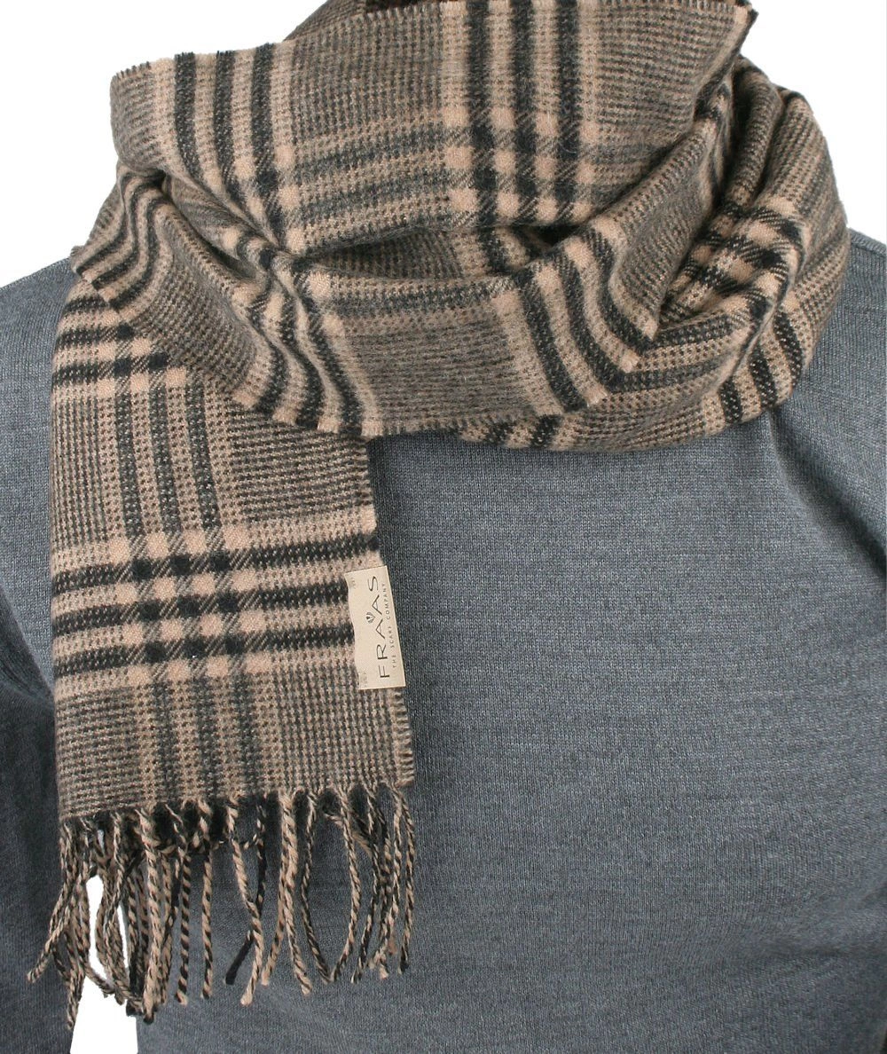 Zimowy szalik znanej niemieckiej firmy V.Fraas istniejącej na rynku już prawie 130 lat. Szaliki nie tylko chronią szyję przed zimnem, są też doskonałym urozmaiceniem męskiej garderoby. Zachowane w stonowanej kolorystyce. Pasują zarówno do eleganckiego, jak i typowo miejskiego, luźnego stroju. Wymiary szalika (w cm) – długość (z frędzlami): ok. 180 / szerokość: ok. 30 (+/- 5 cm). Materiał: 100% czysta, żywa wełna (ang. pure new wool).